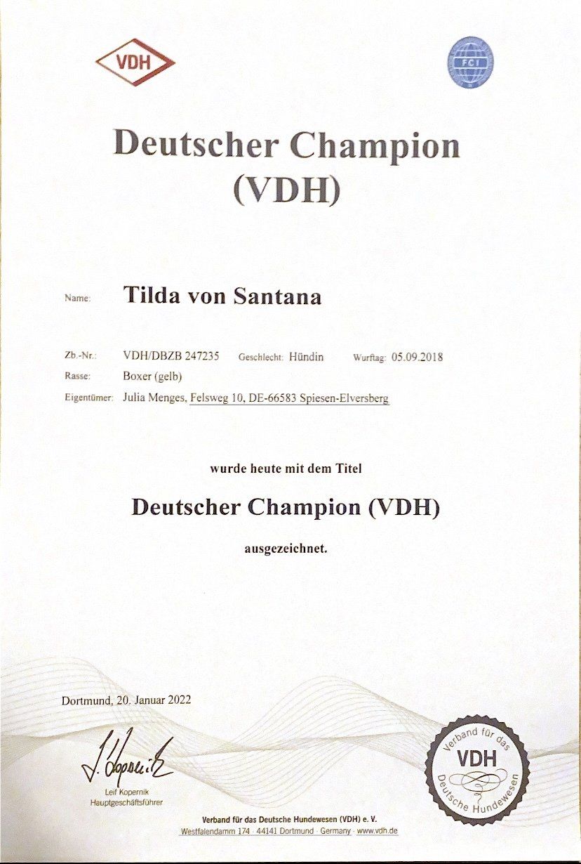Heute kam schöne Post vom VDH. Unserer Tilda wurde der Titel ,DEUTSCHER CHAMPION VDH' verliehen. Wir sind sehr stolz uns freuen uns sehr über diesen Titel.